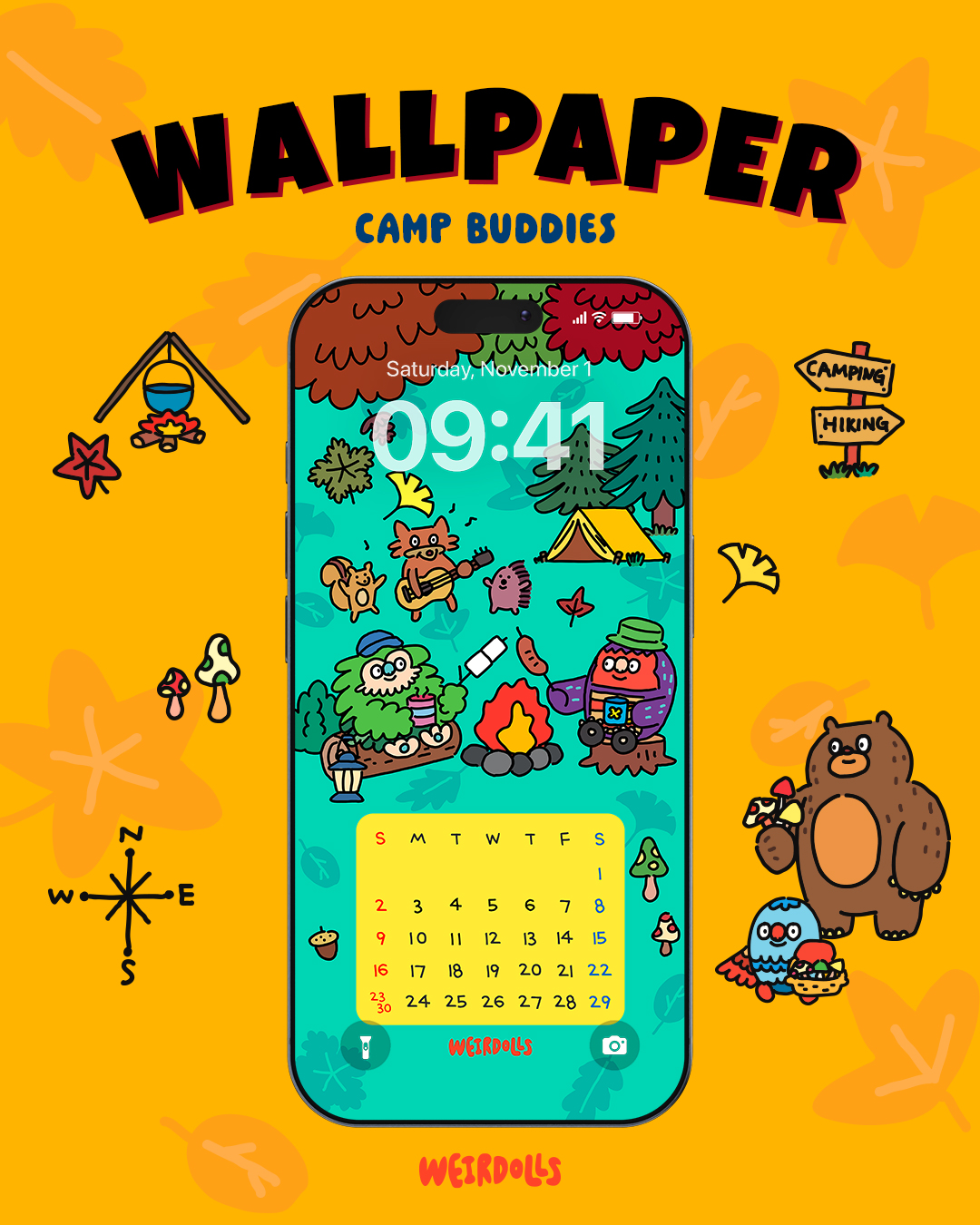 2025년 11월 위어돌스의 휴대폰 배경화면을 공유합니다.날씨가 쌀쌀하지만 친구들과 캠핑을 즐기며따뜻한 가을을 보내보아요! 🔥🌙자유롭게 다운받아 사용하세요! <배경화면 다운로드 방법>1. 이미지를 꾹 누르고 내 폰에 저장 또는 다운로드를 선택하세요.2. 화면 크기에 따라 이미지 사이즈를 조정하여 사용하세요. 참고해 주세요:이 이미지는 개인적인 용도로만 사용 가능하며,상업적 사용 및 무단 배포는 금지됩니다.위반 시 법적 책임이 발생할 수 있습니다.©2025. WEIRDOLLS ALL RIGHTS RESERVED. We’re sharing Weirdolls’ November 2025 mobile wallpaper!The weather’s getting chilly, but it’s the perfect time to enjoy warm autumn moments camping with friends. 🔥🌙Feel free to download and use it as your wallpaper! <How to Download the Wallpaper>1. Press and hold the image, then select Save to Phone or Download.2. Adjust the image size according to your screen dimensions. Please note: This image is for personal use only.Commercial use or unauthorized distribution is strictly prohibited.Any violations may result in legal liability.©2025. WEIRDOLLS ALL RIGHTS RESERVED. ↓다운로드 이미지↓↓ Download Image ↓ 캠프 버디즈Camp Buddies IOS Android
